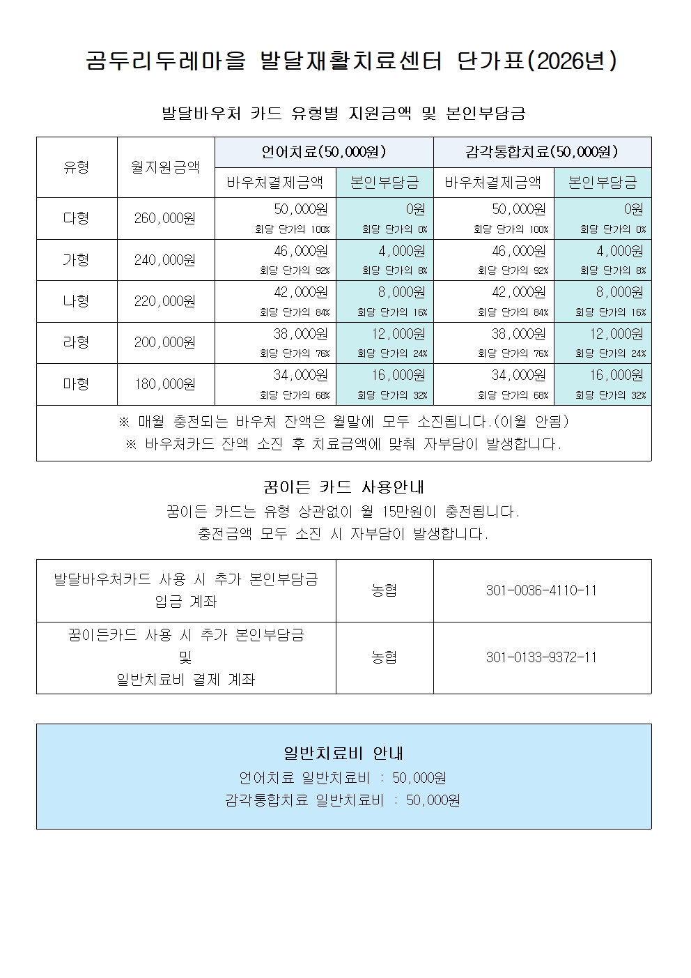 곰두리두레마을 치료센터 에서는 26년 발달재활 바우처 지원금액 상향 및 인근 치료센터의 치료비 평준에 맞추어