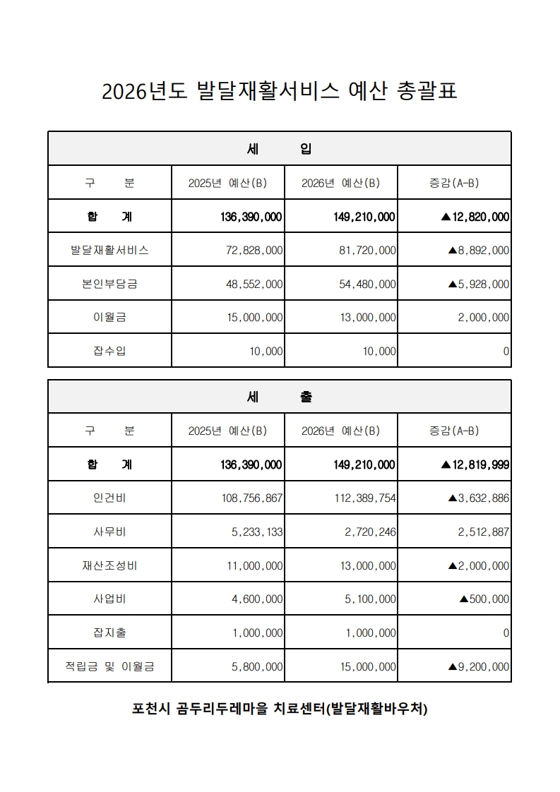 아래와 같이 2026년도 곰두리두레마을 발달재활치료센터의 예산(안)을 공개합니다.